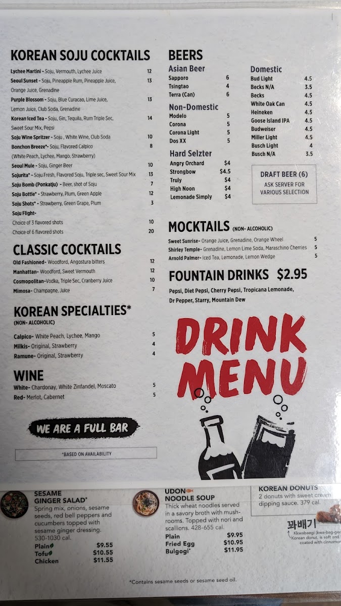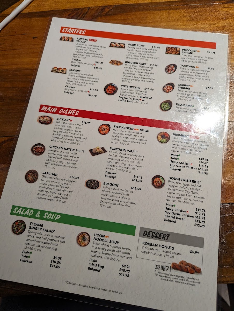 Glass noodles, red bell pepper, carrots, onions, spinach, mushrooms and bulgogi stir-fried with Soy Garlic sauce and topped with sesame seeds. (*Contains sesame seeds or sesame seed oil.)